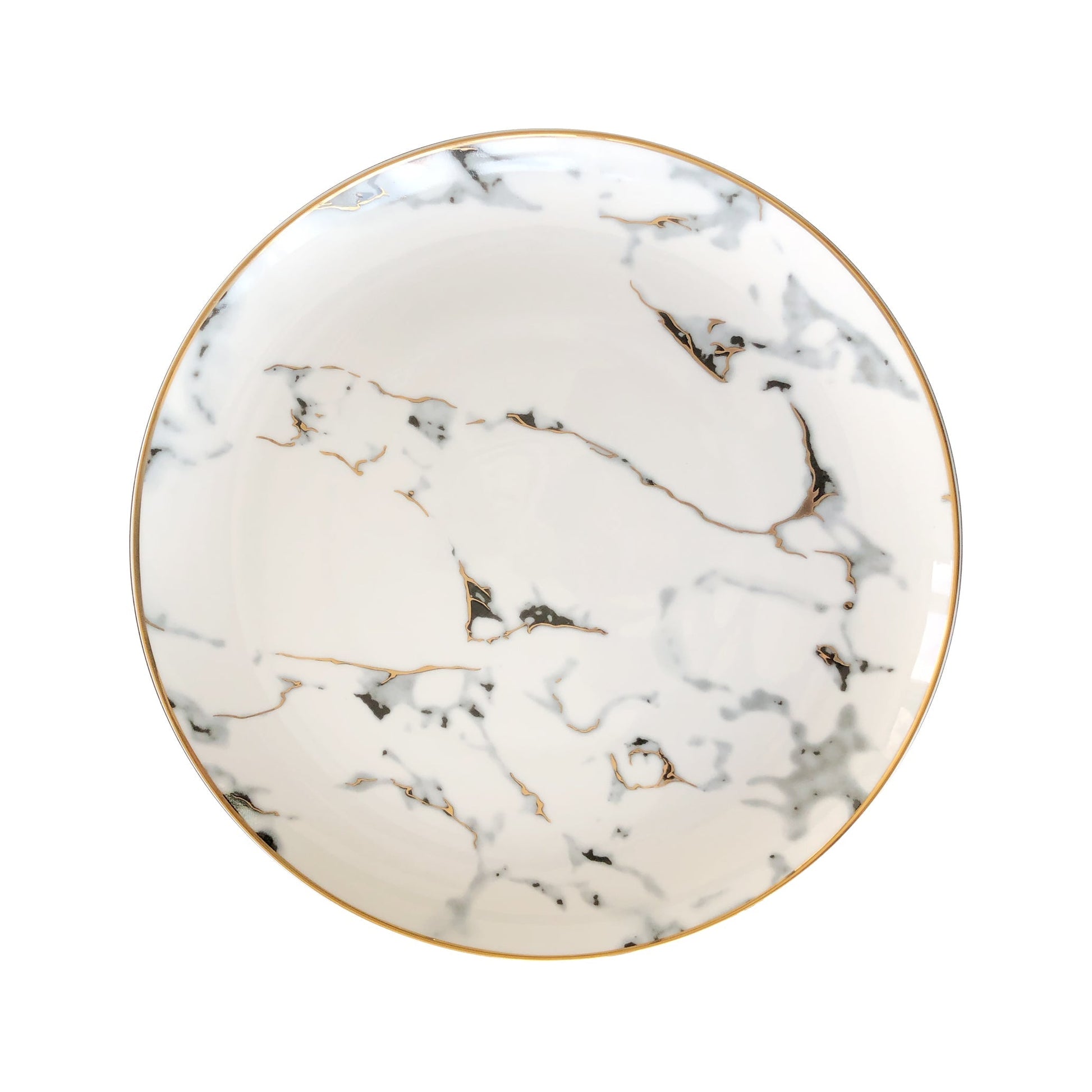 Dette eksklusive serviessæt i marmerlook tilfører straks bordet en chic og moderne elegance. Den hvide og grå marmorstruktur kombineret med gyldne detaljer giver en sofistikeret atmosfære – både til hverdag og til festlige lejligheder.