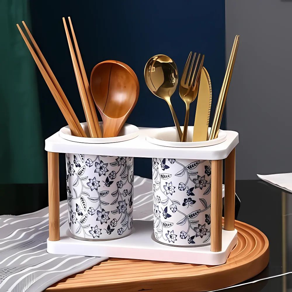Blomstra är den dubbla bestick- och köksredskapshållaren som kombinerar stil och funktion på ett naturligt sätt. Med sina två keramikkrukor med ett delikat blåvitt blommönster och ett minimalistiskt bambufat blir den en vacker och smart lösning för att hålla dina redskap torra och organiserade. Perfekt för hemmakocken som vill ha både ordning och charm i köket.