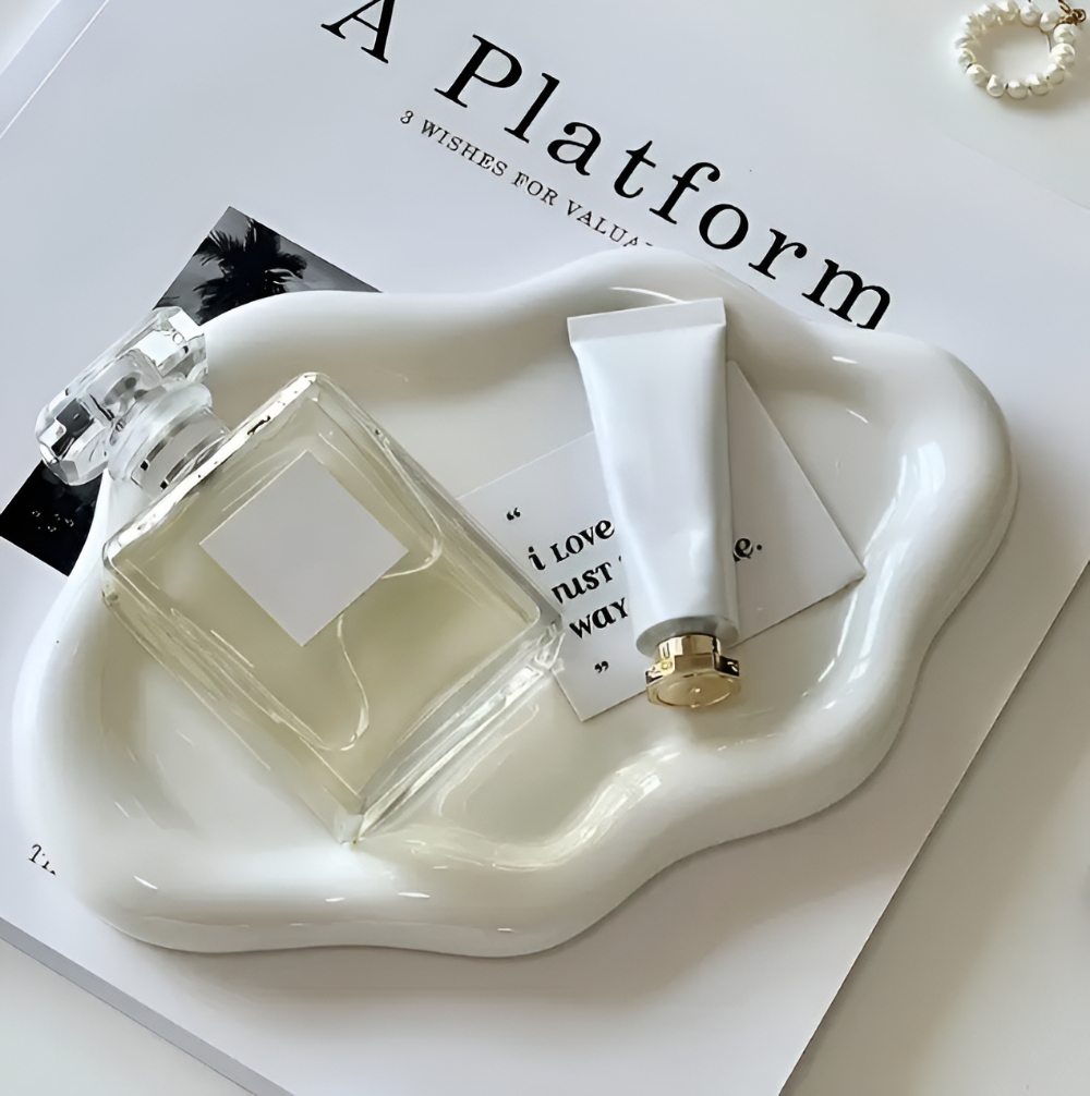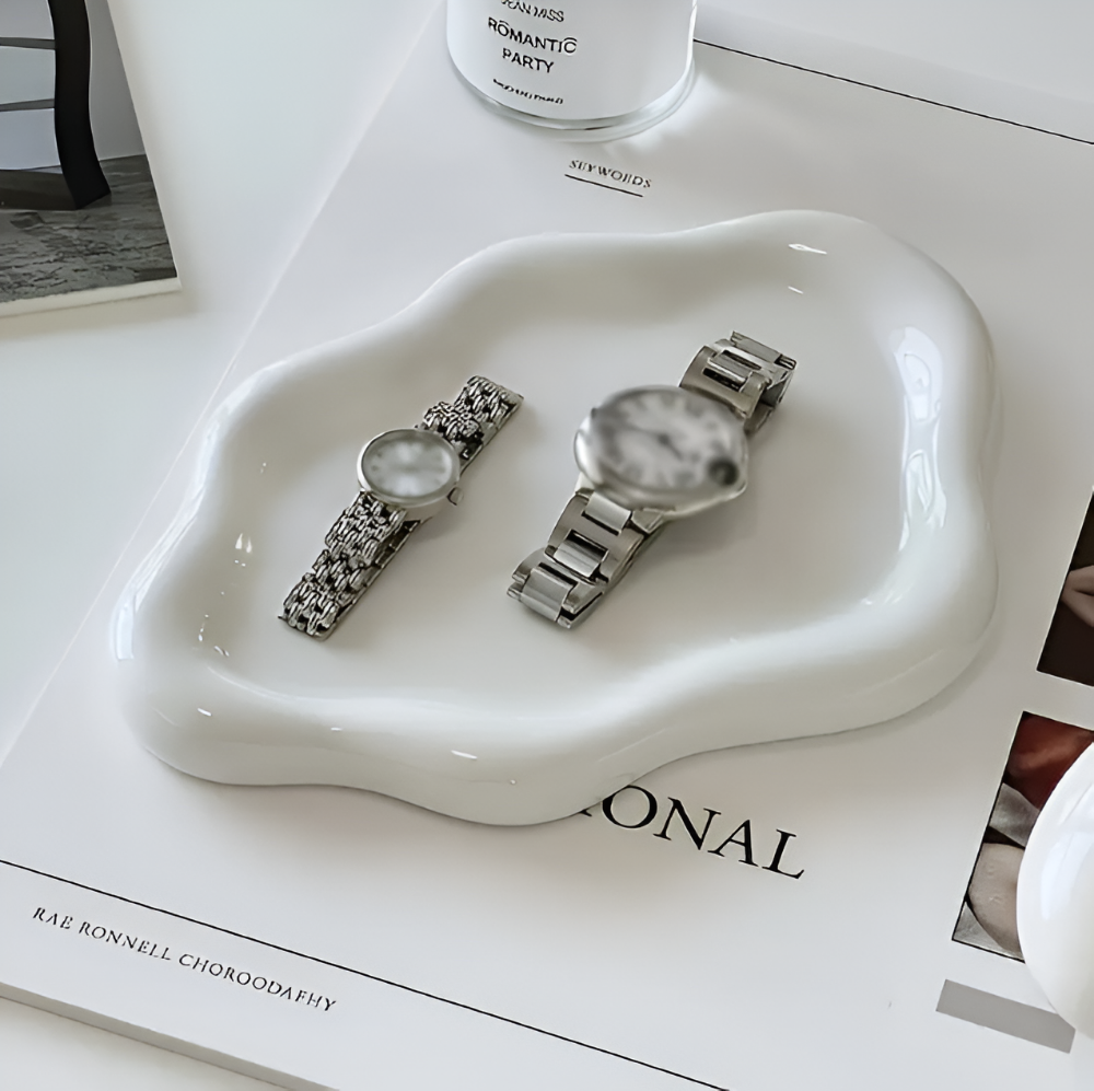 Forma er et keramisk smykkefad med bløde, organiske linjer og en elegant glans. Den kunstneriske form og kompakte størrelse (19,5 x 13,5 cm) gør det til et perfekt indslag på natbordet, sminkebordet eller i badeværelset – både praktisk og dekorativt.