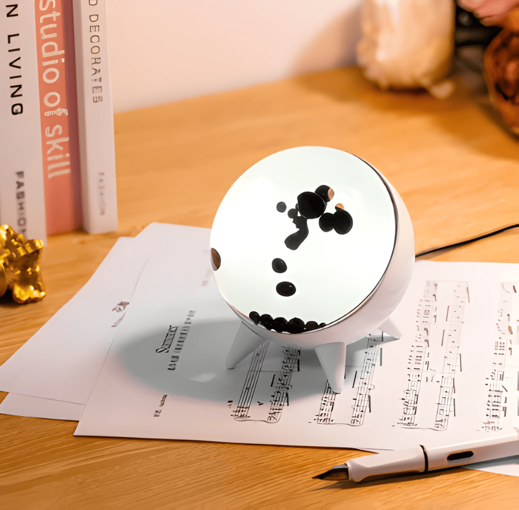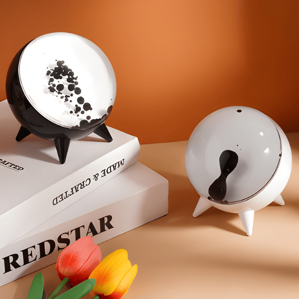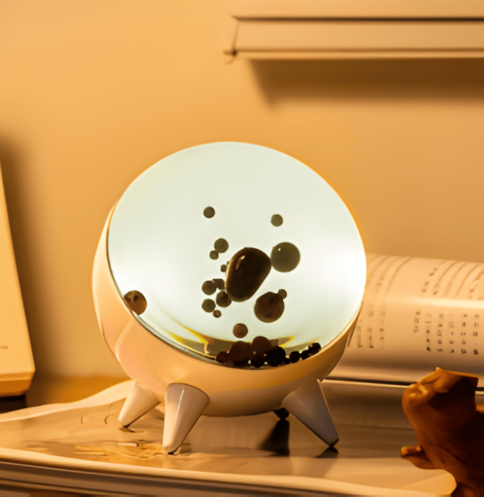 Nuvia er en kompakt LED-lampe med bobleeffekt, der blander retro nostalgi med moderne rumslook. De svævende sorte dråber bevæger sig langsomt i en blødt oplyst sfære – perfekt til at skabe stemning i soveværelse, kontor eller på natbordet.