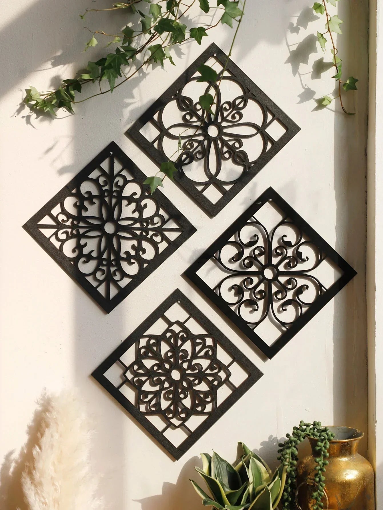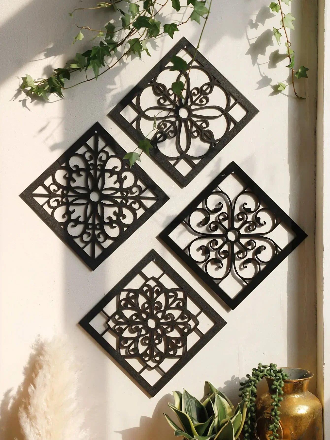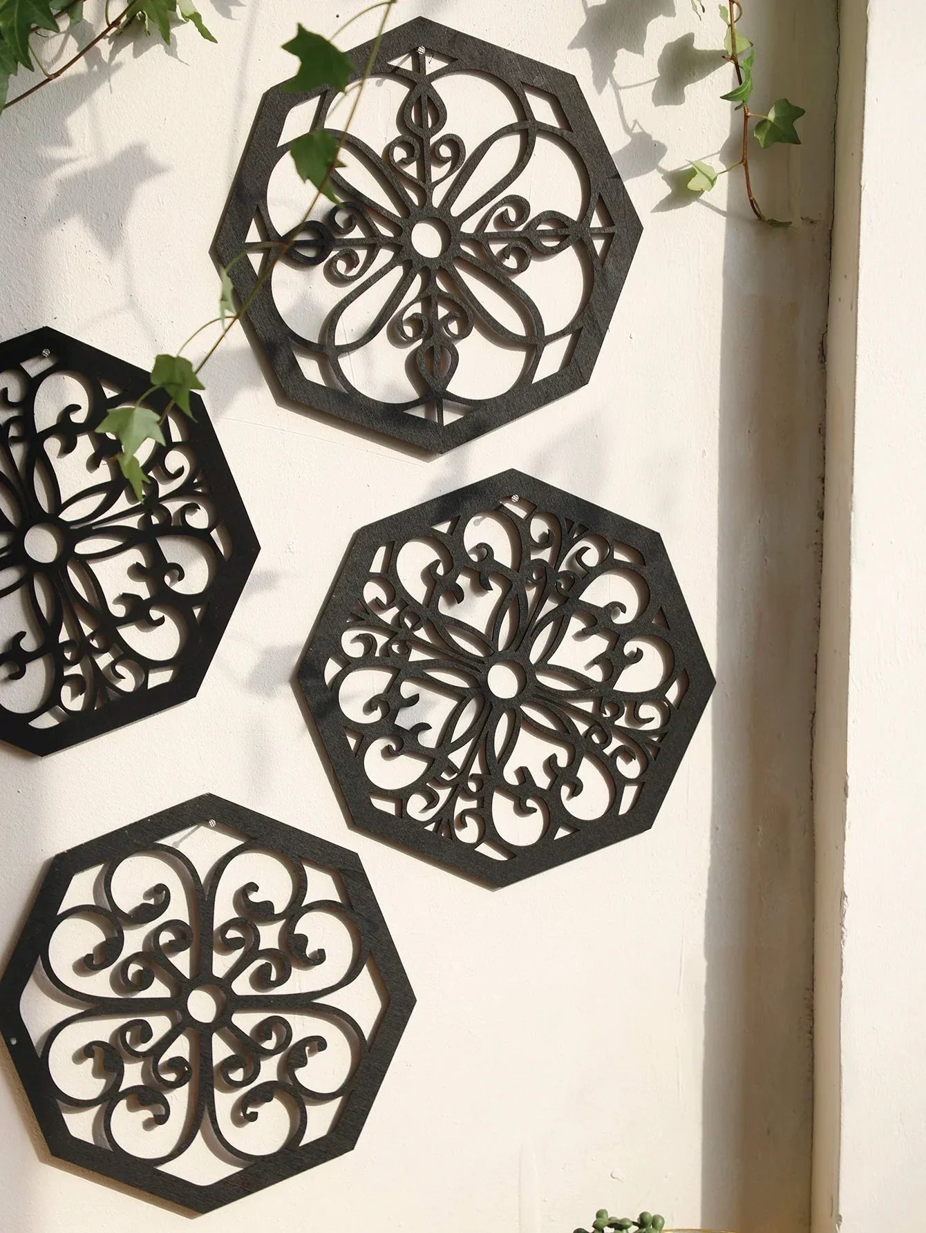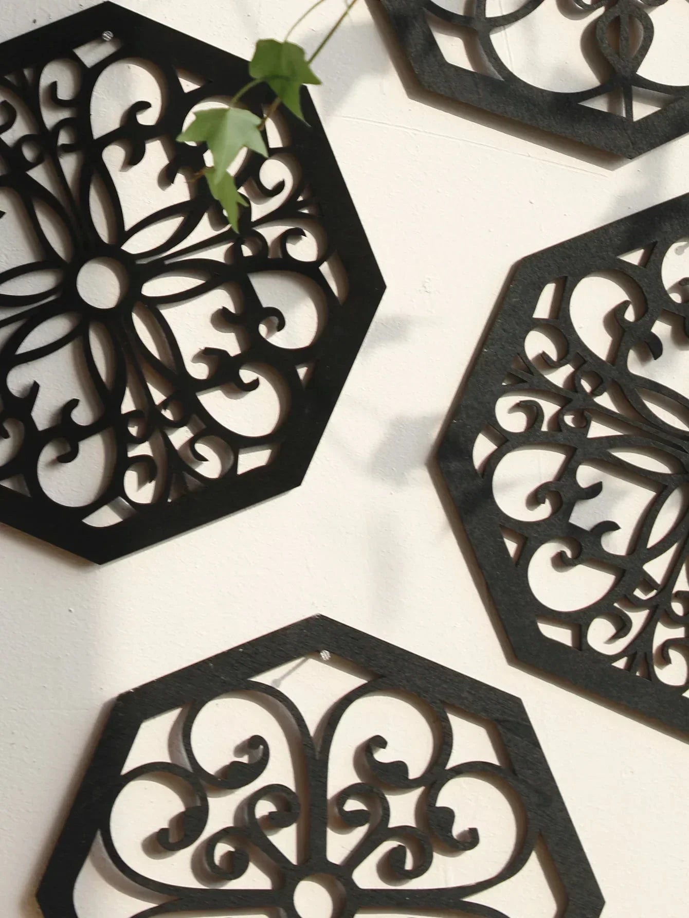 Ornamenta er et sæt dekorative vægpaneler i sort metal med elegante geometriske former som romber og oktagoner. De åbne mønstre skaber et luftigt og kunstnerisk udtryk, perfekt til at give liv til tomme vægge – både indendørs og udendørs. Designet balancerer mellem boho, middelhavsromantik og moderne minimalisme.