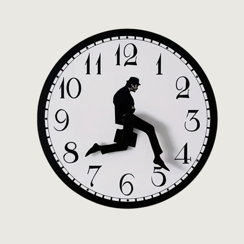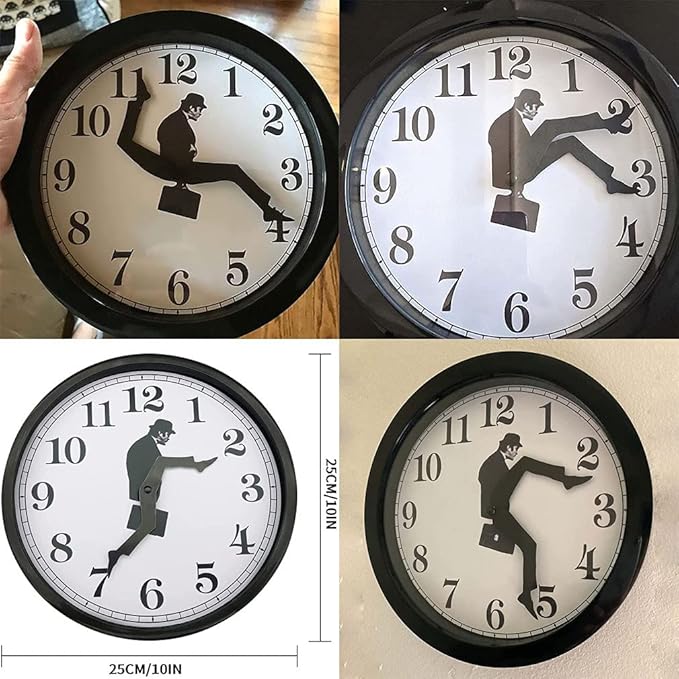I stedet for almindelige visere viser en silhuet af en løbende forretningsmand tiden – hans ben bevæger sig i takt med timer og minutter, hvilket skaber en livlig og underholdende effekt. Den hvide urskive med sorte tal og en stilren ramme giver en skarp kontrast, der fremhæver det grafiske design.